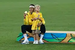 Pela Seleção Brasileira, Neymar estreou em 2010, aos 18 anos, e em 2023 superou Pelé para tornar-se o maior artilheiro da Amarelinha segundo a contagem da FIFA.[12] Principal nome do time que disputou a Copa do Mundo de 2014, o atacante marcou quatro gols em cinco partidas, mas sofreu uma grave lesão na coluna durante as quartas de final contra a Colômbia, o que o afastou da competição. No ano anterior havia conquistado o título da Copa das Confederações, sendo a principal estrela brasileira durante os cinco jogos da campanha, onde fez quatro gols e deu três assistências, tendo, inclusive, levado o prêmio de melhor jogador da competição e ainda a Chuteira de Bronze. Participou ainda das Copas do Mundo de 2018 e 2022, tendo marcado dois gols em ambas, mas sem conseguir impedir o Brasil de cair nas quartas de final. Também disputou três edições da Copa América, em 2011, 2015 e 2021, porém não conquistou a competição sul-americana. Em 2016, Neymar fez parte do elenco que ganhou o primeiro título olímpico da história da Canarinho, convertendo o pênalti que garantiu o título e saindo como herói.