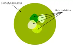 Podemos definir nicho ecológico como um conjunto de diversas variáveis ambientais relacionadas a uma determinada espécie, tais como o habitat onde se encontra, seu papel no ecossistema (produtores, consumidores, decompositores, etc.), seu poder de adaptação a fatores limitantes (umidade, pH, tipo de solo, etc.) e necessidades de reprodução (locais de tocas).[carece de fontes]
