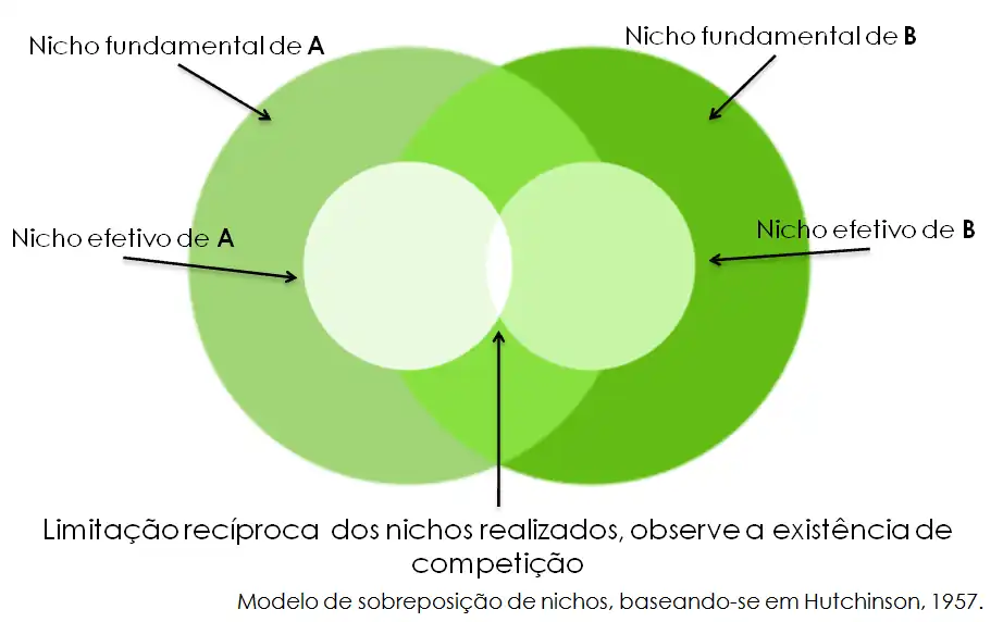 Acontece quando necessidades de organismos diferentes são semelhantes, podendo ou não gerar competição. Quando os organismos utilizam um recurso em comum e de forma semelhante, diz-se que seus nichos alimentares — um conjunto de dimensões do nicho ecológico — são muito sobrepostos, logo poderá ocorrer competição em diferentes intensidades, dependendo da dimensão da sobreposição. Isso causa um estreitamento do nicho realizado. Porém, pode não haver nenhum tipo de competição em organismos com nichos sobrepostos, pois estes podem simplesmente viver nas mesmas condições ambientais. Por exemplo, uma onça-pintada não irá competir com um castanheiro por recursos.[5]