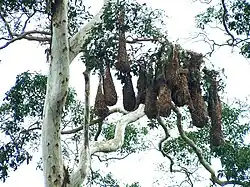 Embora a maioria das aves nidifique individualmente, algumas espécies - incluindo aves marinhas, pinguins, flamingos, muitas garças, gaivotas, andorinhas, tecelões, alguns corvídeos e alguns pardais - se reúnem em colônias consideráveis. As aves que nidificam colonialmente podem se beneficiar de maior proteção contra a predação. Eles também podem ser capazes de usar melhor os suprimentos alimentares, seguindo forrageiras mais bem-sucedidas para seus locais de forrageamento.[20]