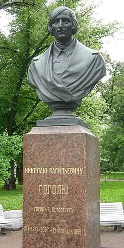 Nikolai Vasilievich Gogol (em russo: Николай Васильевич Гоголь; em ucraniano: Микола Васильович Гоголь; transliteração: Mykola Vassyliovytch Hohol; Sorochyntsi, Poltrávia, Império Russo, 20 de marçojul./ 1 de abril de 1809greg.Moscovo, 21 de fevereirojul./ 4 de março de 1852greg.), foi um proeminente escritor do Império Russo. Sua nacionalidade é motivo de polêmica, pois sua cidade natal fazia parte do Império Russo na época, mas atualmente pertence à Ucrânia. Como consequência, tanto a Rússia quanto a Ucrânia reivindicam a sua nacionalidade.[1] Apesar de muitos de seus trabalhos terem sido influenciados pela tradição ucraniana, Gogol escreveu em russo e sua obra é considerada herança da literatura russa. Toda a sua obra é fundada no realismo, mas um realismo muito próprio, com rasgos do que viria a ser o surrealismo.