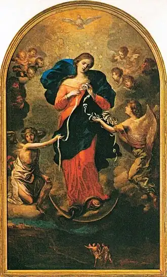 Sobre a Virgem o Espírito Santo derrama suas luzes. Um dos anjos entrega a Maria uma fita com nós grandes e pequenos, separados e juntos, apertados e frouxos, que simboliza a nossa culpa original. Um outro anjo recebe das mãos de Maria a fita que cai livremente com os nós desfeitos. Significa uma vida mergulhada em Deus e na sua misericórdia e o poder libertador das mãos de Maria.