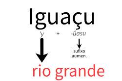 O vocábulo "Iguaçu" é um termo proveniente do tupi, originalmente ygûasu. Seu significado é "rio grande" ou ainda "água grande", através da junção dos termos y (rio, água)[30] e gûasu (sufixo que forma o grau aumentativo).[30][31] É uma referência dos índios jacutingas, naturais da região, ao Rio Iguaçu, outrora um rio caudaloso.