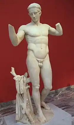 Em Grécia desenvolveram-se as principais manifestações artísticas que marcaram a evolução da arte ocidental. Após destacar as culturas minoica e micénica, a arte grega desenvolveu-se em três períodos: arcaico, clássico e helenístico. Grécia foi o primeiro lugar onde se representou o corpo humano de uma forma naturalista, longe do hieratismo e da esquematização das culturas precedentes. Para os gregos, o ideal de beleza era o corpo masculino nu, que simbolizava a juventude e a virilidade, como os atletas dos Jogos Olímpicos, que competiam nus. O nu grego era ao mesmo tempo naturalista e idealizado: naturalista quanto à representação fidedigna das partes do corpo, mas idealizado quanto à procura de umas proporções harmoniosas e equilibradas, recusando um tipo de representação mais real que mostrasse as imperfeições do corpo ou as enrugas da idade.[66]