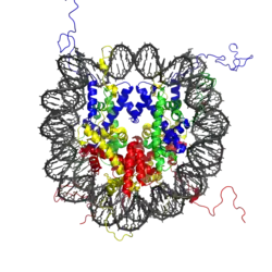 Nucleossoma é, nos seres eucariontes, a unidade fundamental da cromatina. Consiste numa unidade de DNA, dividida em duas espirais, que se enrolam em torno de um disco proteico, constituído por quatro pares de proteínas chamadas histonas (H2A, H2B, H3 e H4).[1]