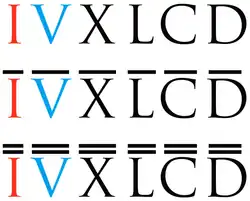 Outro sistema para representar números maiores é o vinculum, pelo qual números romanos convencionais são multiplicados por 1 000 ao ter um traço horizontal sobre os mesmos.[12] Linhas adicionais verticais antes e depois do numeral são usadas para adicionais multiplicações para 100 milhares ou um milhão.