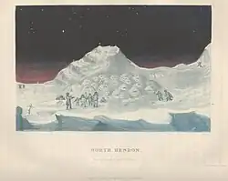 Representação da expedição no Ártico liderada por James Ross dirigindo-se a um assentamento inuíte, em 1835