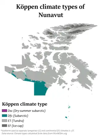 Tipos climáticos do território de Nunavut segundo a climatologia de Köppen.
