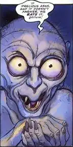 Na primeira edição de O Hobbit, Gollum voluntariamente aposta seu anel mágico sobre o resultado do jogo do enigma, e ele e Bilbo trataram-se amigavelmente.[9] Na segunda edição, para refletir o novo conceito do Anel e sua habilidade de corromper, Tolkien fez Gollum mais agressivo em relação a Bilbo e perturbado com a perda do Anel. O encontro termina com a maldição de Gollum: "Ladrão! Ladrão, Bolseiro! Nós odeia ele, nós odeia ele, nós odeia ele para sempre!". Isto pressageia a descrição de Gollum em O Senhor dos Anéis.