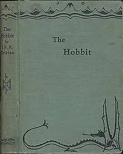Sobrecapa da primeira edição de O Hobbit, tirada de um desenho do autor. | ||||