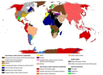 A URSS ruiu em 1941 e foi ocupada pelos nazistas, enquanto a maioria dos povos eslavos foram exterminados. Os eslavos sobreviventes da guerra foram confinados a "reservas em regiões fechadas". Os japoneses, por outro lado, destruíram totalmente as tropas dos Estados Unidos no ataque a Pearl Harbor. Dada a expansão de suas capacidades militares, o Japão foi capaz de invadir e ocupar o Havaí, a Austrália, a Nova Zelândia e o Sudoeste do Pacífico, no início dos anos 1940. Posteriormente, os Estados Unidos caíram no controle do Eixo.