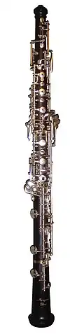 O oboe moderno melhorou quanto à qualidade de fabricação das peças, mas difere pouco do sistema de pratos. Hoje, é o modelo mais fabricado em Paris.[25] Entre as invenções notáveis do século XX, destaca-se a chave de ressonância para o fá de forquilha (posição conhecida como fourchu em francês[29] e fork em inglês[30]), criada por Bonnet em 1907. A melhoria do trilo ré♯–mi deve-se a Bienzet. Também foi acrescentada uma chave de ressonância para o si♭₂ e uma terceira chave de oitava, destinada a facilitar a execução das notas sobreagudas e oferecer maior segurança ao intérprete.[31]