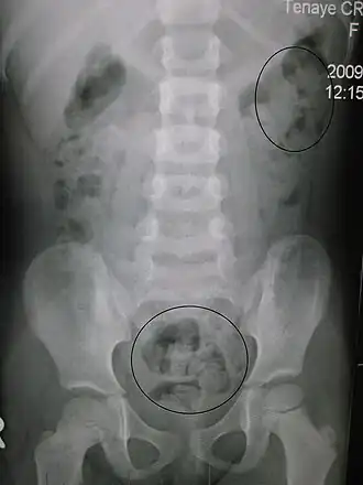 | Raio-x de obstipação numa criança. Os círculos assinalam os locais opacos de aglomeração de fezes. | |