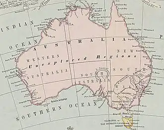 Mapa da Austrália mostrando o Southern Ocean imediatamente sobre sua costa sul.
