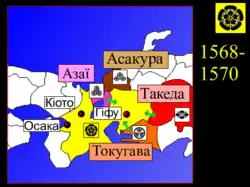 Depois de conquistar Gifu, Nobunaga revela suas intenções de conquistar o Japão usando o sinete pessoal de Tenka Fubu (o mundo nas mãos). Casou sua Irmã Oichi com Azai Nagamasa, um daimyo da Parte Norte da Província de Ōmi. Isso mais tarde ajudaria a pavimentar o caminho em direção a Kyoto.