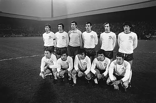 Em 1974, Blokhin foi novamente eleito o jogador soviético do ano,[77] bem como o artilheiro do campeonato nacional, com 20 gols.[31] Nele o Dínamo pôde ser, com duas rodadas de antecedência, campeão soviético - em título garantido após empate em 3-3 com o Pakhtakor Tashkent.[86] Também venceu-se a Copa da URSS, em final na qual o Dínamo teria entrado em campo já com camisa de campeão, tamanha a confiança, antes de vencer por 3-0 o Zorya Voroshlovgrado.[10] Pela temporada, Blokhin foi também considerado entre os vinte melhores jogadores da Europa nas premiações da Bola de Ouro da revista France Football.[87] Em paralelo, o clube avançava às fases decisivas da Recopa Europeia de 1974-75. Nela, à altura de maio de 1975, o Dínamo tornou-se ao primeiro clube soviético a conseguir um título europeu.[88] Antes mesmo da conquista, já era elogiado como "o novo Ajax" pela própria imprensa neerlandesa, após a classificação nas semifinais diante do PSV Eindhoven estrelado pelos gêmeos René e Willy van de Kerkhof.[80]