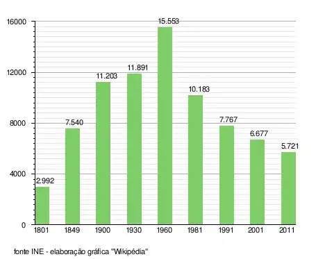 (Obs: De 1900 a 1950 os dados referem-se à população "de facto" (**) ou seja, que estava presente no município à data em que os censos se realizaram. Daí que se registem algumas diferenças relativamente à designada população residente)