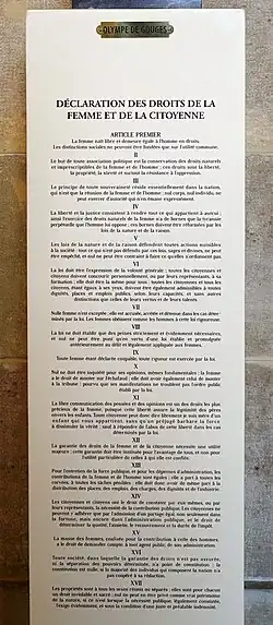Como apaixonada advogada dos direitos humanos, Olympe de Gouges abraçou com destemor e alegria a deflagração da Revolução. Mas logo se desencantou com a constatação de que a égalité (direitos iguais) da Revolução não incluía as mulheres no que se refere à igualdade de direitos.[1][2]