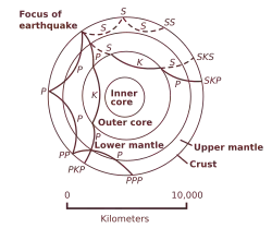 Para o estudo do interior do planeta faz-se uso das ondas P e S produzidas pelos terremotos, uma vez que estas se deslocam de forma diferente nos vários tipos de material.