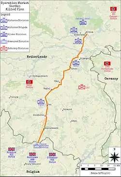 Operação Market Garden foi uma operação militar Aliada realizada durante a Segunda Guerra Mundial, entre os dias 17 e 25 de setembro de 1944. Seu objetivo tático era capturar uma série de pontes sobre os rios principais dos Países Baixos ocupados pelos alemães. Para isso, foram utilizadas tropas paraquedistas em larga escala, em conjunto com um rápido avanço de unidades blindadas pelas estradas, a fim de atingir o propósito estratégico de permitir que os Aliados pudessem atravessar o Reno, a última grande barreira natural a um avanço sobre à Alemanha.[4]