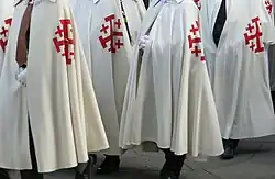 Atualmente a Ordem conta com 20 mil[2] Cavaleiros e Damas, os quais recebem a precedência de vestirem capa branca, no caso dos Cavaleiros, e capa preta e véu, no caso das Damas, bordada com o símbolo máximo de Jerusalém: a Cruz vermelha de Jerusalém, enquadrada por outras quatro pequenas cruzes, em recordação às cinco feridas sofridas por Jesus Cristo.[1]