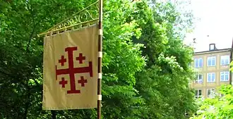 Principal símbolo da Ordem, acredita-se que esta cruz tenha surgido no século XI para ser o símbolo do Reino de Jerusalém. As cinco cruzes representam as chagas de Cristo, sendo as quatro pequenas a dos membros e a maior se refere ao trespasse da lança de Longino.[30]
