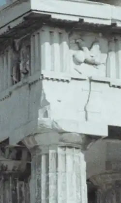 A coluna de estilo dórico surgiu nas costas do Peloponeso, ao sul, no início do século VII a.c. A ordem dórica, a mais antiga das existentes na arte grega, apresenta formas geométricas, regras rígidas, uma elegância formal e um equilíbrio de proporções. É principalmente empregada no exterior de templos dedicados a divindades masculinas e é a mais simples das três ordens gregas definindo um edifício em geral baixo e de caráter sólido. A coluna não tem base, tem entre quatro e oito módulos de altura, o fuste é raramente monolítico e apresenta vinte estrias ou sulcos verticais denominados de caneluras.[2] O capitel é formado pelo equino, ou coxim, que se assemelha a uma almofada e por um elemento quadrangular, o ábaco. O friso é intercalado por módulos compostos de três estrias verticais, os tríglifos, com dois painéis consecutivos lisos ou decorados, as métopas. A cornija apresenta-se horizontal nas alas, quebrando-se em ângulo nas fachadas de acordo com o telhado de duas águas.