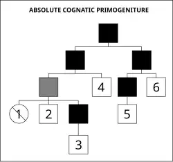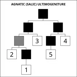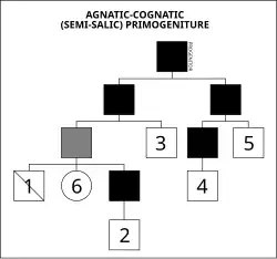Também é conhecida como lei semi-sálica. Desta forma, a sucessão em primeiro lugar era reservada a todos os descendentes do sexo masculino dinásticos de todos os ramos elegíveis por ordem de primogenitura e, em seguida, após a extinção total desses descendentes masculinos para a mais velha de descendentes dinásticos do sexo feminino. No passado, algumas monarquias também utilizaram este sistema, tais como o Império Austríaco (mais tarde Império Austro-Húngaro), o Reino da Baviera, o Reino de Hanôver, o Reino de Württemberg, o Império Russo, o Reino da Saxônia, o Grão-Ducado da Toscana e o Reino das Duas Sicílias. No entanto, note que se um descendente do sexo feminino estivesse para tomar o trono, ela não seria necessariamente a herdeira, mas possivelmente o parente mais próximo, em relação ao actual monarca. Por exemplo, um Príncipe A tendo um irmão, o Príncipe B. O Príncipe A torna-se rei, e depois morre com apenas uma filha, a Princesa X. O Príncipe B, irmão do anterior, torna-se assim Rei B. O Rei B tem uma filha, a Princesa Y, e depois morre. Não há mais herdeiros do sexo masculino. Embora a Princesa X fosse de uma linhagem de reis mais antiga, a sua prima, a Princesa Y, é a herdeira do trono, por descender de uma linhagem mais próxima, tornando-se assim Rainha Y.