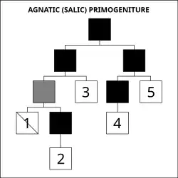 A sucessão agnatícia (também chamada de Lei sálica) institui a completa exclusão das mulheres da dinastia e dos seus descendentes, da sucessão. A Lei sálica foi aplicada nas Casas da Albânia, França, Itália, Coreia, Roménia, Jugoslávia, Prússia e Império alemão. Actualmente aplica-se às casas do Liechtenstein, do Japão e da Jordânia. Geralmente, monarquias hereditárias que operam sob a Lei sálica também utilizam a primogenitura entre os descendentes do sexo masculino na linha masculina para determinar o legítimo sucessor, embora antigamente fosse mais habitual que a primogenitura.