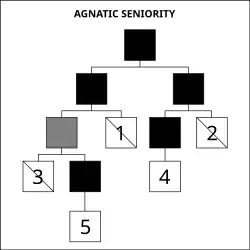 Na sucessão por antiguidade, escolhe-se a linhagem ou o herdeiro mais velho. Por exemplo, tendo um monarca falecido sem filhos, a sucessão passa para o seu irmão mais velho, e na falta de irmãos, passa para as linhagens dos irmãos do seu pai, e assim sucessivamente até se encontrar um herdeiro.