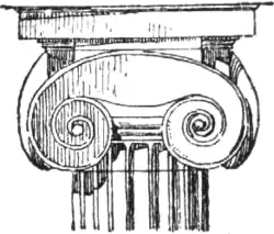 A Ordem Jônica surge a leste da Grécia oriental e seria, por volta de 450 a.C., adotada também por Atenas. Desenvolvendo-se paralelamente ao dórico apresenta, no entanto, formas mais fluidas e uma leveza geral, sendo mais utilizado em templos dedicados a divindades femininas. A coluna possui uma base larga, tem geralmente nove módulos de altura, o fuste é mais elegante e apresenta vinte e quatro caneluras. O capitel acentua a analogia vegetal da coluna pela criação de um elemento novo entre o coxim e o ábaco de caráter fitomórfico. Este elemento dispõe de dois “rolos” consideravelmente projetados para os lados, as volutas. O friso passa a ter elemento único decorado em continuidade.