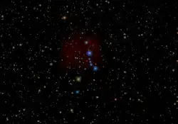 Meissa (mais brilhante no centro) e outras estrelas azuis que fazem parte do aglomerado aberto Collinder 69. Abaixo, também azul, a estrela Phi1 Orionis e abaixo a esquerda, amarela, Phi2 Orionis.