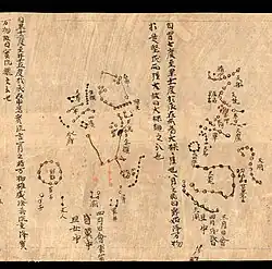 Descrição de Órion na Carta estelar Dunhuang, uma das primeiras representações gráficas do céu na astronomia chinesa, feitas por volta de 700 d.C..