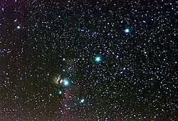 No entanto, uma das características mais distintas da constelação de Órion é o seu cinturão, formado por três estrelas similares alinhadas com aproximadamente a mesma distância visual.[22] Mintaka (Delta Orionis) Alnilam (Epsilon Orionis) e Alnitak (Zeta Orionis) possuem um brilho similar branco azulado. No entanto, Mintaka e Alnitak são sistemas binários com distância de aproximadamente 800 anos-luz.[23][24] Alnilam, por sua vez, situa-se a mais de 1 300 anos-luz da Terra e, mesmo assim, é a mais brilhante do trio por ser uma supergigante azul, que supera em 375 000 vezes a luminosidade do Sol.[25]