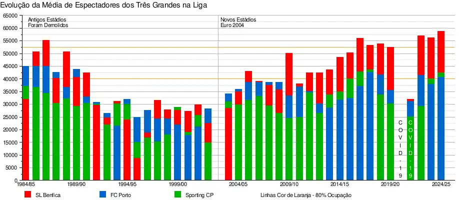 Assim, "Os Três Grandes" têm a maior audiência média de público em cada temporada na Primeira Liga, enquanto que as outras equipas, sem o apoio da população local, têm sofrido com fracas assistências (com excepção do Vitória de Guimarães, a única outra equipa com uma assistência média superior à média de público da Primeira Liga), em parte devido ao monopólio dos Três Grandes.[11][12]
