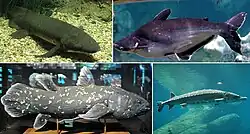 Exemplo de Osteichthyes: Peixe-pulmonado-australiano e Latimeria chalumnae (2 Sarcopterygii), Pangasianodon hypophthalmus e esturjão-atlântico (2 Actinopterygii)