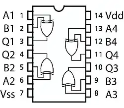 Abaixo temos um exemplo de um Circuito Integrado XOR, de duas entradas.