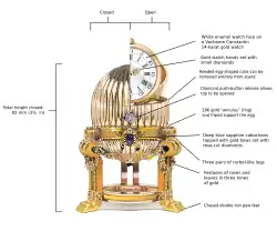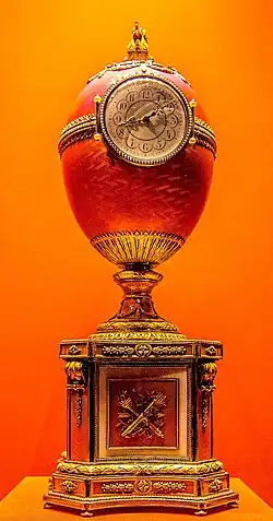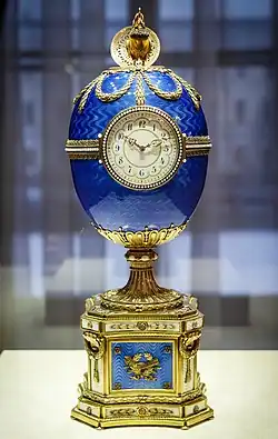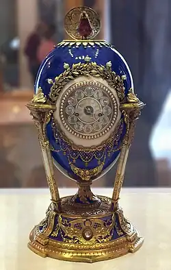| 1887 | Terceiro Imperial | ![]() | Um ovo de ouro amarelo cravejado de joias com relógio Vacheron & Constantin fica em seu pedestal de tripé original, que tem pés de pata de leão perseguidos e é cercado por guirlandas de ouro coloridas suspensas de safiras azuis cabochão encimadas por laços de diamantes rosa. Depois de ser descoberto em um mercado de pulgas americano, em 2014 foi comprado pelo joalheiro londrino Wartski em nome de um colecionador particular não identificado.[5] | Coleção privada[6] |