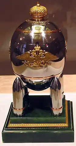 | 1916 | Ordem de São Jorge | Feito durante a Primeira Guerra Mundial, o ovo da Ordem de São Jorge comemora a Ordem de São Jorge que foi concedida ao imperador Nicolau e seu filho, o grão-duque Alexei Nikolaievich. O Ovo da Ordem de São Jorge e sua contraparte, o Ovo Militar de Aço, eram de design modesto, de acordo com a austeridade da Primeira Guerra Mundial,[14] e Fabergé cobrou 13.347 rublos pelos dois. O ovo da Ordem de São Jorge deixou a Rússia bolchevique com sua destinatária original, a imperatriz viúva Maria Feodorovna.[15] | Viktor Vekselberg | |