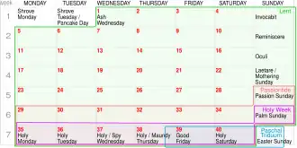 No cristianismo ocidental, usando o calendário gregoriano, a Páscoa sempre cai num domingo entre 22 de março e 25 de abril,[75] cerca de sete dias após a lua cheia astronômica.[76] A sexta-feira anterior, Sexta-feira Santa, e a segunda-feira seguinte, Segunda-feira de Páscoa, são feriados legais em muitos países com tradições predominantemente cristãs.[77]