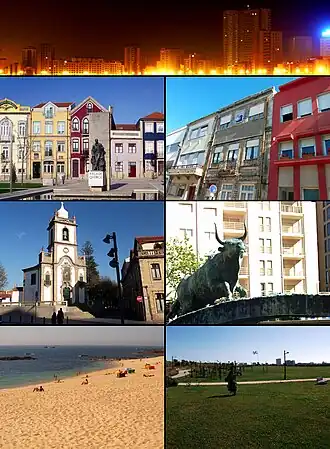![]() No sentido dos ponteiros do relógio: Nova Póvoa, Rua Santos Minho, Touro, Parque da Cidade, Praia da Lagoa, Igreja Senhora das Dores e Praça do Almada.