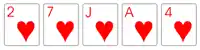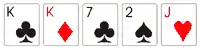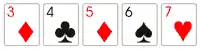 Nos Estados Unidos utiliza-se um baralho comum de 52 cartas. No Brasil as cartas de valor mais baixo são retiradas, de acordo com o número de participantes. Com quatro participantes utilizam-se as cartas do 7 ao Ás; com cinco jogadores, do 6 ao Ás. Embora os grupos possam ser constituídos de dois até oito jogadores, as mesas formadas de quatro a sete são consideradas ideais. Para cada jogador a mais no grupo, uma outra carta será acrescentada. Assim, se forem seis os participantes, o cinco é incluído. O Ás é a carta mais alta, mas também pode entrar nas sequências como a mais baixa. Exemplo: se o 7 estiver no jogo, a sequência máxima será A-K-Q-J-10 e a mínima 10-9-8-7-A.