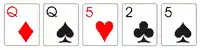 Pôquer (português brasileiro) ou póquer (português europeu) (do inglês poker) é um jogo de cartas jogado por duas ou mais pessoas muito comum em casinos. É considerado o jogo de cartas mais popular do mundo,[1] e o mais popular entre uma classe de jogos nos quais os participantes utilizam as cartas de forma total ou parcialmente escondidas fazendo apostas para um monte central, após o resultante das apostas é atribuído ao jogador ou jogadores que possuir(em) o melhor conjunto de cartas entre os que permaneceram até o final da rodada, ou ao jogador restante caso os demais tenham desistido. Quando houver uma dupla na mão do jogador e uma dupla na mesa, essa não pode ser usado como critério de desempate em caso de uma jogada superior de outro jogador.