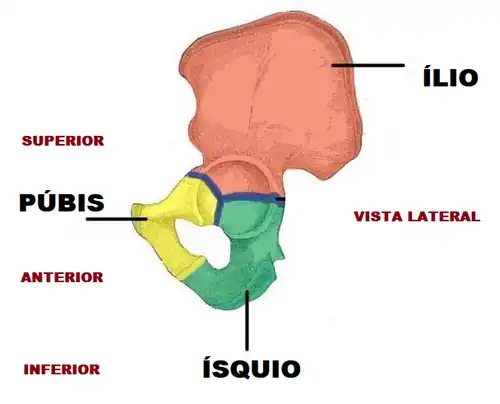 O púbis é um osso angulado que consta de uma rama superior do púbis, o qual constitui uma porção anterior do acetábulo, e uma rama inferior do púbis, incluída no limite inferior do forame obturado.