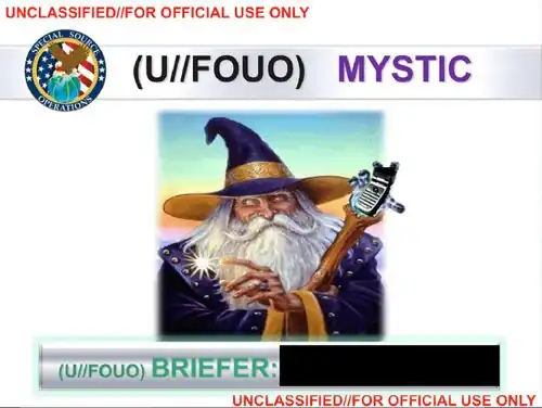 - MYSTIC - programa que é parte integrante e critica do PRISM, para interceptação de áudio (voz) e capaz de gravar "100 por cento" das chamadas telefônicas de um país estrangeiro, o que permite a NSA ou outras agências americanas, retroceder e ouvir na integra conversas telefônicas, mesmo um mês depois de terem ocorrido.[14][15][16]