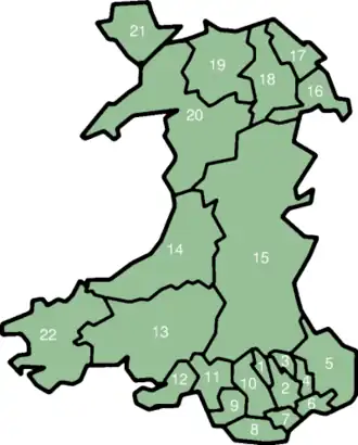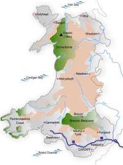 ![]() Localização do País de Gales (em verde escuro) No continente europeu (em cinza escuro) No Reino Unido (em verde claro) | |
