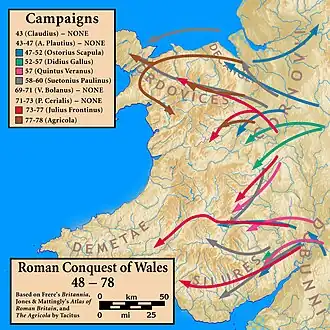 A conquista romana de Gales começou em 48 d.C. e levou 30 anos para ser concluída; a ocupação durou mais de 300 anos. As campanhas de conquista foram combatidas por duas tribos nativas: os Siluros e os Ordovicos. Carataco ou Caradog, líder dos Ordovicos, teve sucesso inicial em resistir às invasões romanas do norte do País de Gales, mas acabou sendo derrotado.[25] O domínio romano no País de Gales foi uma ocupação militar, exceto pela região costeira sul do sul do País de Gales, onde há um legado de romanização.[26] A única cidade no País de Gales fundada pelos romanos foi Caerwent, que fica no sudeste do País de Gales.[27] Tanto Caerwent quanto Carmarthen (localizado também no sul do País de Gales), tornaram-se civitates romanos.[28] O País de Gales tinha uma rica riqueza mineral. Os romanos usavam sua tecnologia de engenharia para extrair grandes quantidades de ouro, cobre e chumbo, bem como quantidades menores de zinco e prata.[29] Não havia empreendimentos significativos no País de Gales neste período;[29] tratava-se, em grande medida, de uma questão de circunstância, uma vez que o País de Gales não dispunha de nenhum dos materiais necessários em combinação adequada, e a paisagem florestal e montanhosa não era passível de empreendimentos. O latim tornou-se a língua oficial do País de Gales, embora o povo continuasse a falar em britônico. Enquanto a romanização estava longe de estar completa, as classes superiores passaram a se considerar romanas, particularmente após a decisão de 212 que concedeu a cidadania romana a todos os homens livres em todo o Império.[30] Outra influência romana veio através da propagação do Cristianismo, que ganhou muitos seguidores quando os cristãos foram autorizados a adorar livremente; A perseguição estatal cessou no século IV, como resultado de Constantino I emitir um édito de tolerância em 313.[30]
