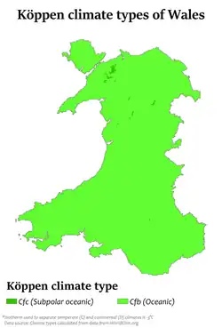 O país tem um clima marítimo, caracterizado por tempo nublado, chuvoso e com vento, porém que é moderado. O formato da costa e as áreas elevadas no centro induzem diferenças localizadas no clima. Enquanto as áreas mais elevadas têm tempo mais severo, a região costeira possui tempo mais calmo. A temperatura média anual nas baixas altitudes varia entre 9,5 °C e 11 °C, decrescendo por aproximadamente 0,5 °C a cada 100 metros de elevação. No inverno, a temperatura é fortemente influenciada pelo mar. O mês mais frio próximo à costa é fevereiro, porém no interior são janeiro e fevereiro. A menor temperatura já registrada no país ocorreu em 21 de janeiro de 1940, em Rhyader, sendo de -23,3°C. A maior temperatura já registrada foi de 35,2 °C, na ponte de Hawarden, em Flintshire.[58]