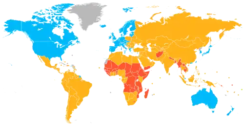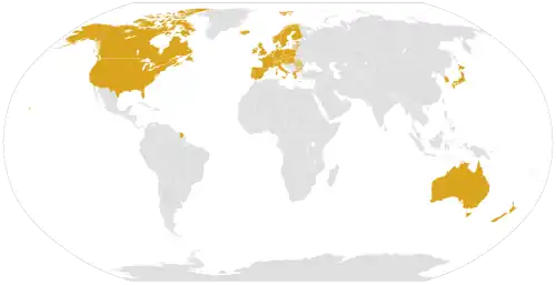 Apenas três instituições produziram listas de "países desenvolvidos". As três instituições e suas listas são a lista das Organização das Nações Unidas (mostrada acima), a lista da CIA[15] e uma lista do Grupo FTSE, cuja lista não está incluída, pois sua associação de países desenvolvidos com países com rendimentos elevados e mercados desenvolvidos não é considerada tão diretamente relevante aqui.[16]