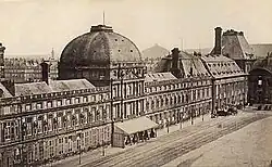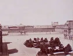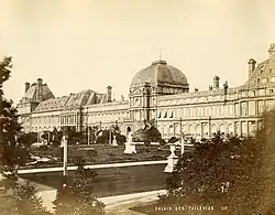 Palácio das Tulherias, cerca de 1865. Da esquerda para a direita: a Ala Sul, o Pavilhão do Relógio, a Ala Norte, o Pavilhão do Teatro, a Galeria das Máquinas e o Pavilhão Marsan. À direita estende-se o Pátio do Carroussel.